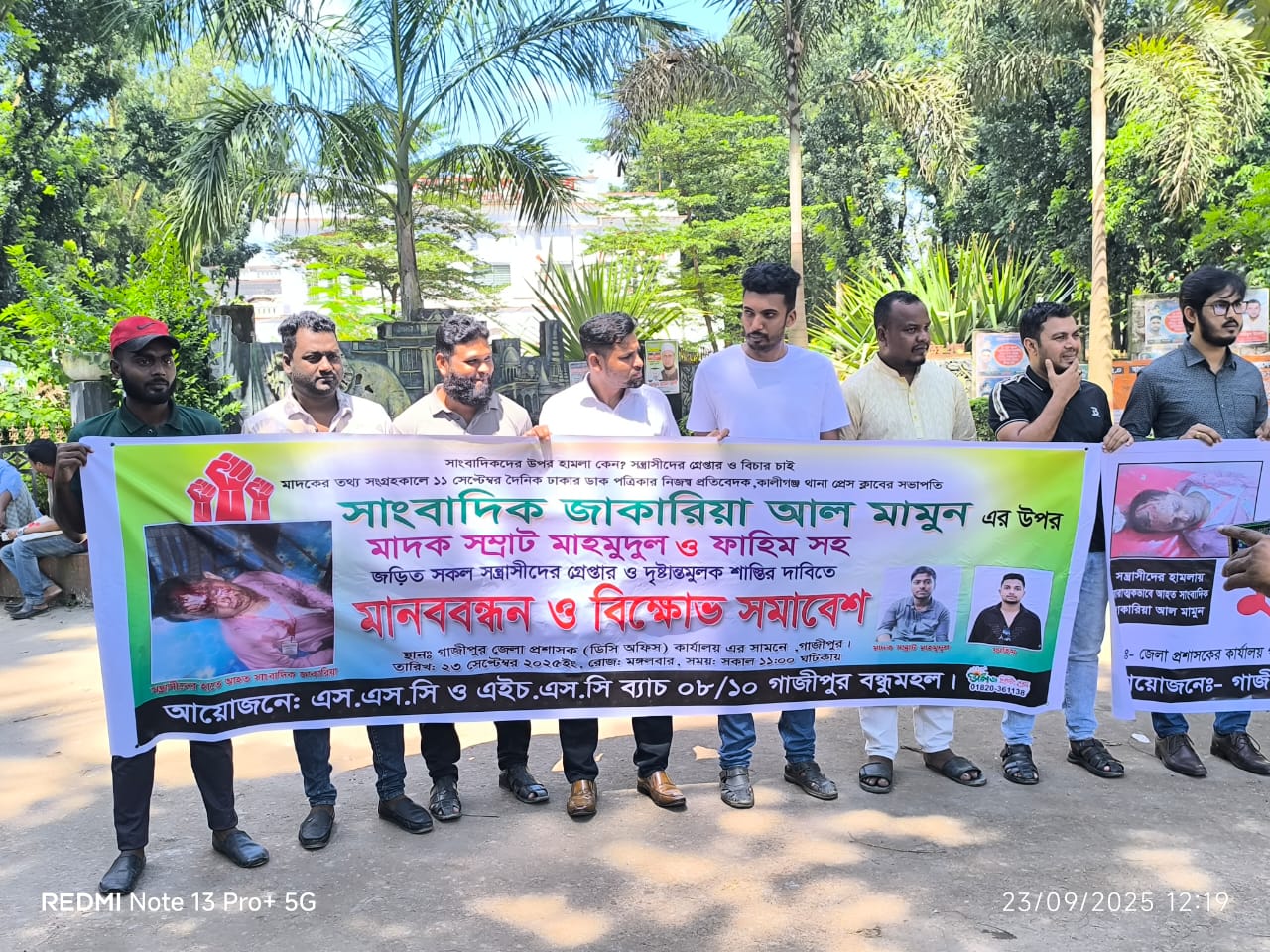 গাজীপুরের কালীগঞ্জের জামালপুরে দৈনিক ঢাকার ডাক পত্রিকার প্রতিনিধি এবং কালীগঞ্জ থানা প্রেসক্লাবের সভাপতি সাংবাদিক জাকারিয়া আল মামুনের উপর সন্ত্রাসী হামলার প্রতিবাদে মানববন্ধ কর্মসূচী ও বিক্ষোভ সমাবেশ করেছে সাংবাদিক, বন্ধু মহল এবং সুশীল সমাজ।
