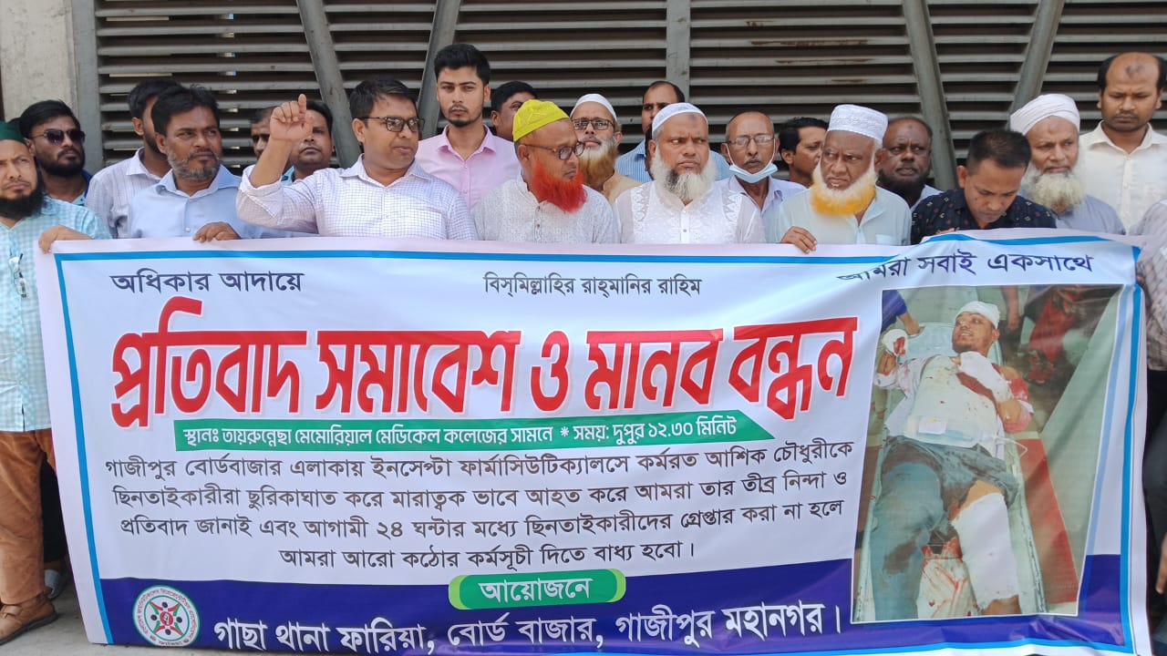 গাজীপুরের গাছায় ইনসেপটা ফার্মাসিউটিক্যালস লিমিটেডের বিক্রয় প্রতিনিধি মো. আশিক চৌধুরীকে কুপিয়ে ২ লাখ ২০ হাজার টাকা ও মোবাইল ছিনতাইয়ের ঘটনায় ক্ষোভে ফেটে পড়েছেন স্থানীয় ওষুধ ব্যবসায়ী ও ফারিয়ার নেতৃবৃন্দ। এ ঘটনার প্রতিবাদে তারা মানববন্ধন কর্মসূচি পালন করেছেন।