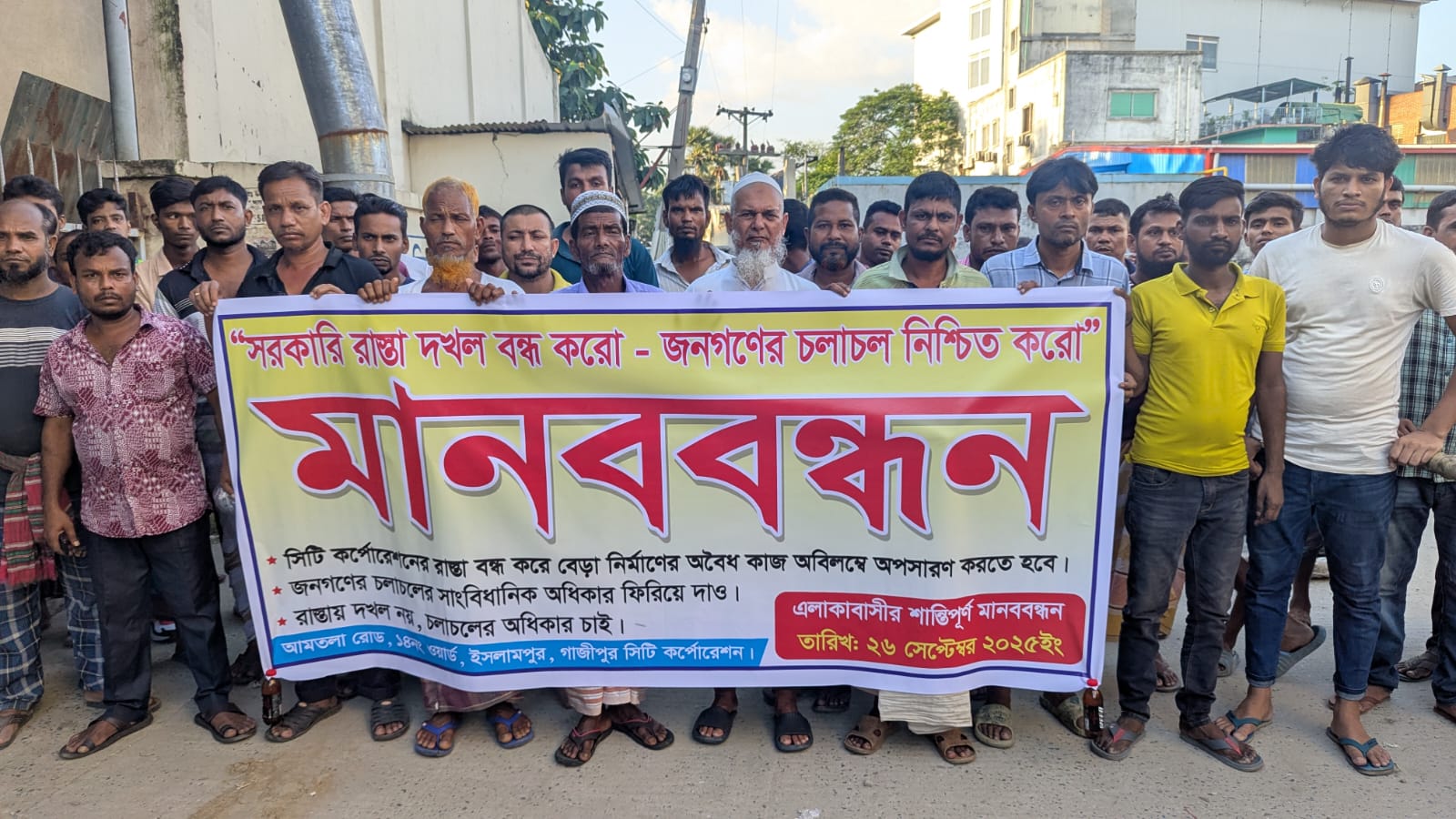 গাজীপুর সিটি করপোরেশনের ১৪ নম্বর ওয়ার্ডের নাওজোড়-ইসলামপুর মোল্লাপাড়ার প্রবেশের প্রধান সড়ক দীর্ঘদিন ধরে বাঁশ দিয়ে ঘেরাও করে বন্ধ রাখা নিয়ে তীব্র প্রতিক্রিয়া জানিয়ে মানববন্ধন করেছে স্থানীয়রা।