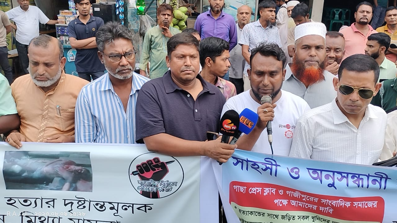 গাজীপুরে সাংবাদিক আসাদুজ্জামান তুহিনকে কুপিয়ে হত্যার প্রতিবাদে মানববন্ধন ও বিক্ষোভ সমাবেশ করেছে স্থানীয় গণমাধ্যমকর্মীরা। শনিবার (৯ আগস্ট) বিকেল ৪টায় নগরীর বোর্ডবাজার ঢাকা–ময়মনসিংহ মহাসড়কে এ কর্মসূচি অনুষ্ঠিত হয়।