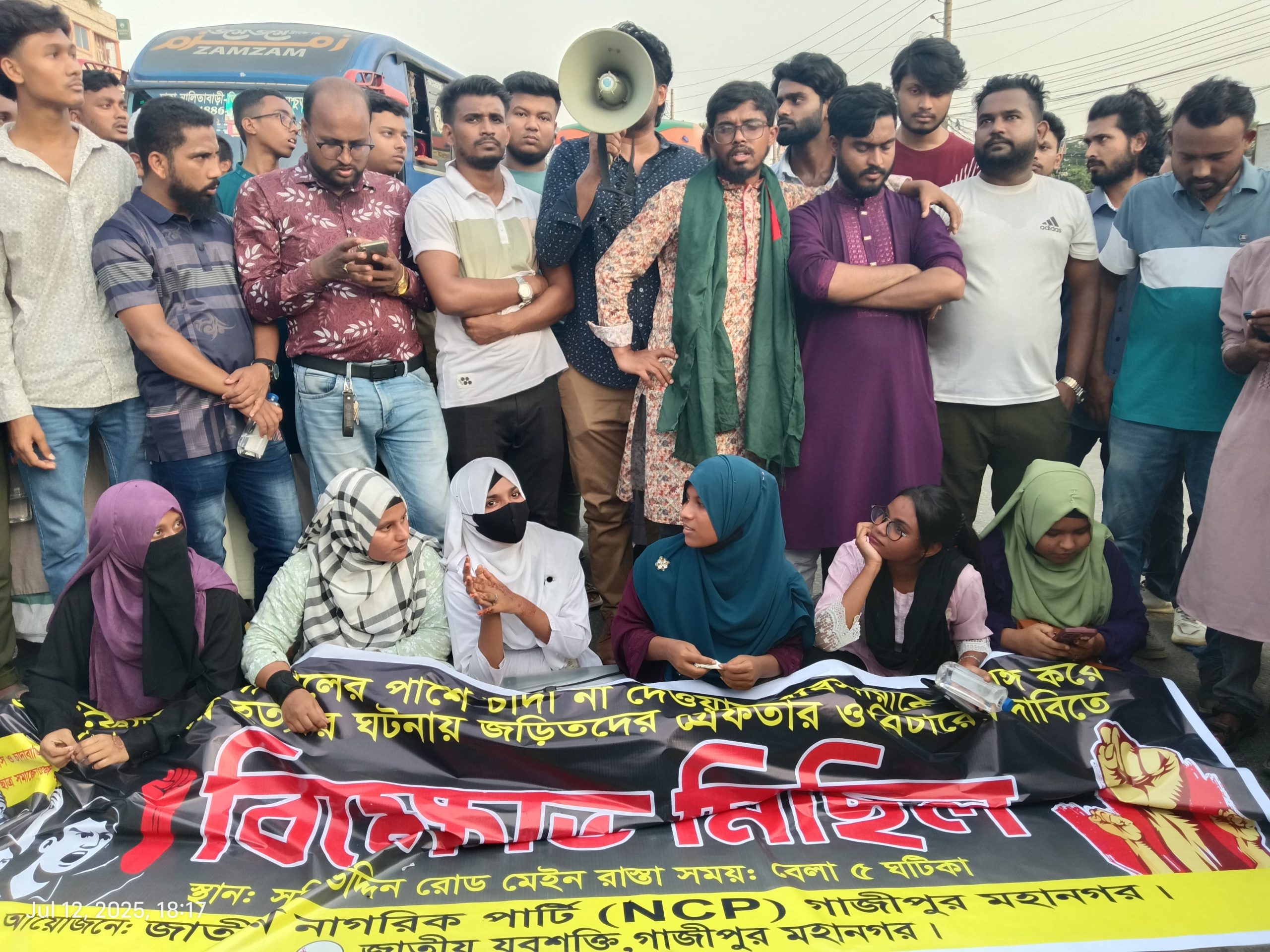 জাতীয় নাগরিক পার্টি (এনসিপি) ও জাতীয় যূবশক্তি গাজীপুর মহানগর শাখার আয়োজনে ঢাকায় ভাঙারি ব্যবসায়ী সোহাগ হত্যার বিচারের দাবিতে বিক্ষোভ সমাবেশ ও আলোচনা সভা অনুষ্ঠিত হয়েছে। শনিবার (১২জুলাই) বিকেল ৫টায় গাজীপুর মহানগরীর শফিউদ্দিন সরকার একাডেমি এন্ড কলেজের সামনে ঢাকা ময়মনসিংহ মহসড়কের উপর এ বিক্ষোভ অনুষ্ঠিত হয়।