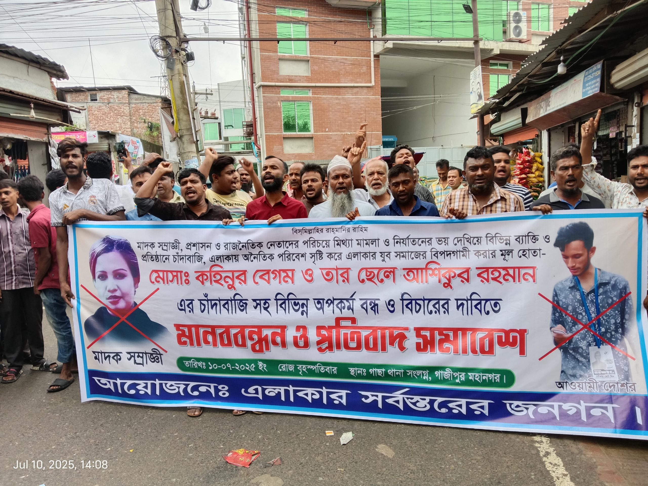 মামলা বাণিজ্য, মিথ্যা মামলায় হয়রানি ও মাদক দিয়ে ফাঁসানো, মোটা অংকের চাঁদাবাজি-সহ নানা অভিযোগ তুলে প্রতিবাদ করে এর প্রতিকার চেয়ে অবস্থান কর্মসূচি পালিত হয়েছে গাজীপুরে। বৃহস্পতিবার (১০জুলাই) দুপুর ২টায় মহানগরীর গাছা মেট্রো থানার সামনে এক নারী ও তার সন্তানের বিরুদ্ধে এসব অভিযোগ তোলে প্রতিকার চেয়ে এই অবস্থান কর্মসূচি পালন করেন স্থানীয় এবং ভূক্তভূগী বাসিন্দারা।