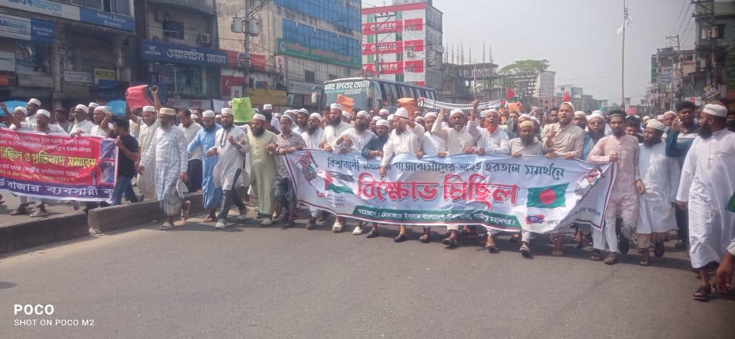 ফিলিস্তিনে ইসরাইলি গণহত্যা ও বর্বরোচিত হামলার প্রতিবাদে গাজীপুর জেলায় সোমবার ব্যাপক বিক্ষোভ হয়েছে। সোমবার বাদ আসর গাজীপুর কেন্দ্রীয় মসজিদের সামনে থেকে নগরীতে একটি বিক্ষোভ মিছিল বের করে মহানগর জামায়াতে ইসলামী। মিছিলে ইসরাইলি আগ্রাসনের নিন্দা, ফিলিস্তিনের নাগরিকদের ওপর চালানো গণহত্যার প্রতিবাদ ও স্বাধীন ফিলিস্তিনের দাবিতে বিভিন্ন শ্লোগানে প্রকম্পিত হয় নগরী। গাজীপুর মহানগর জামায়াতের আমির অধ্যাপক জামাল উদ্দিনের সভাপতিত্বে প্রতিবাদ সমাবেশে বক্তব্য রাখেন, মহানগর জামায়াতের নায়েবী আমির খায়রুল হাসান, মো: হোসেন আলী, মহানগর সেক্রেটারী আবু সাঈদ মোঃ ফারুক, ছাত্র-শিবিরের কেন্দ্রীয় সাবেক সভাপতি সালাউদ্দিন আইউবী, নুরুল আমিন, আজাহারুল ইসলাম, সাখাওয়াত হোসেন, অ্যাডভোকেট ছাদেকুজ্জামান খান প্রমুখ।