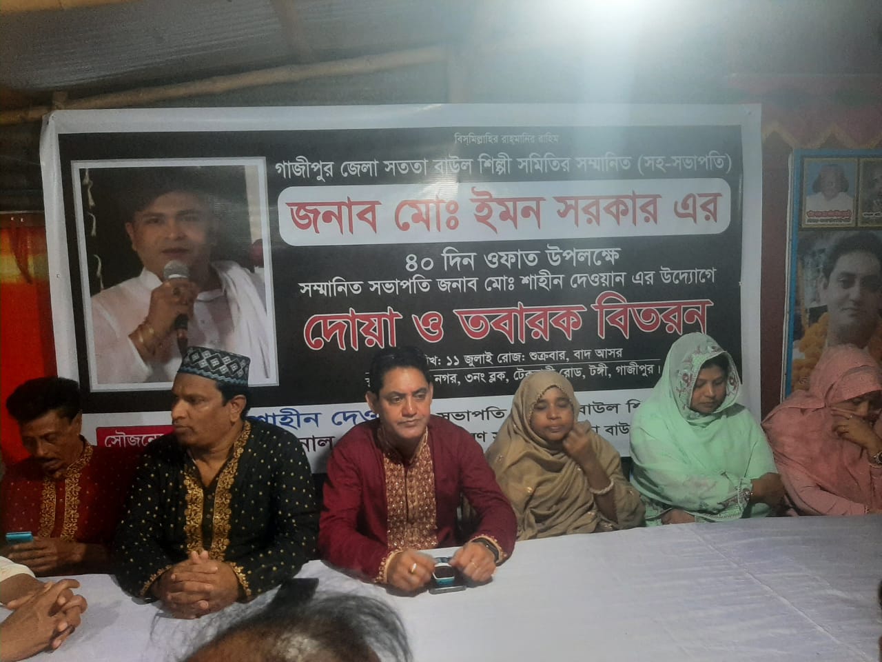 গাজীপুর জেলা সততা বাউল শিল্পী সমিতির সম্মানিত সহ-সভাপতি মরহুম জনাব মোঃ ইমন সরকার এর ৪০ দিন ওফাত উপলক্ষে আলোচনা সভা দোয়া ও তবারক বিতরণ করা হয়।ঠ